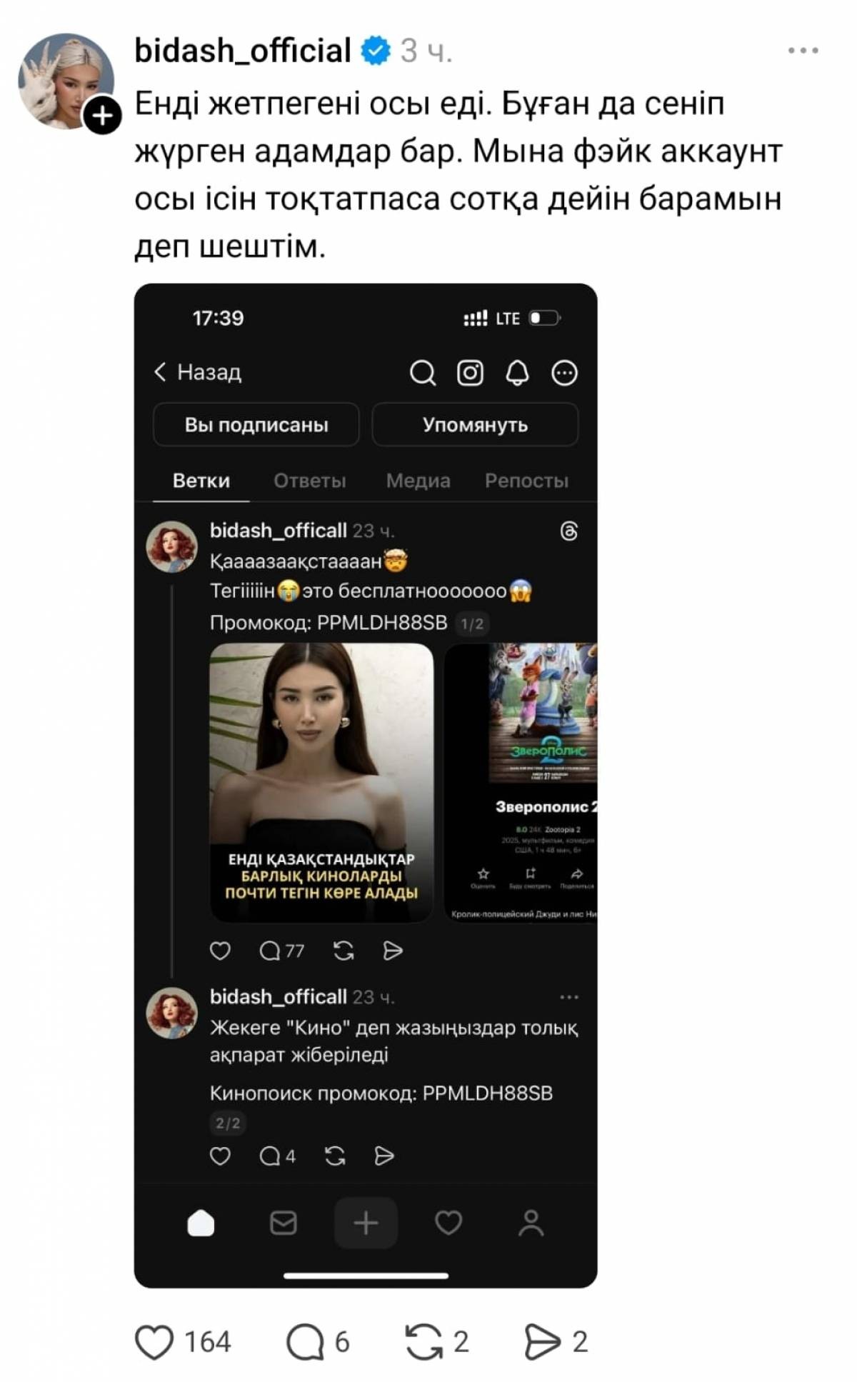 Сондай-ақ ол жалған аккаунттың жазбаларын скриндеп, тыңдармандарын сақтыққа шақырған.