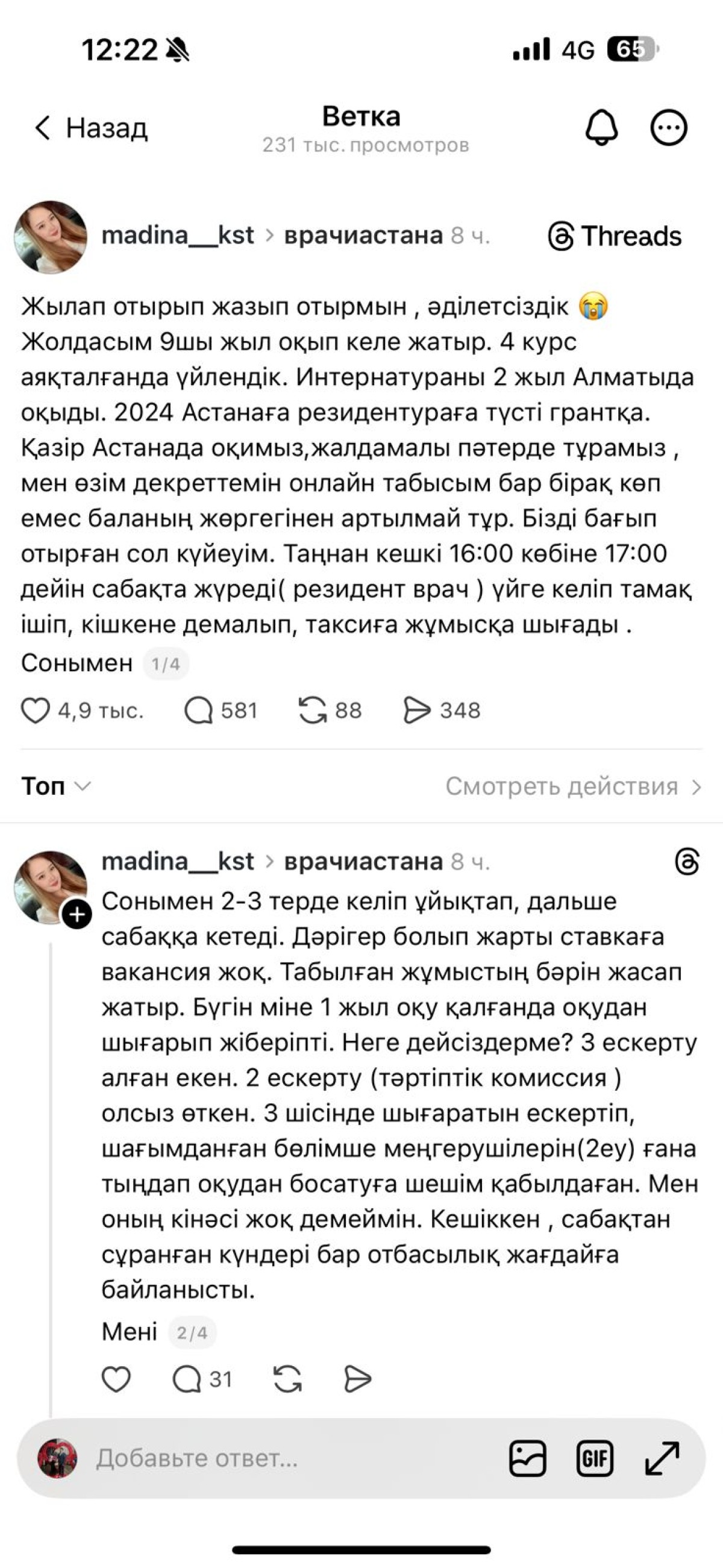 Threads желісінде madina__kst есімді қолданушы резидент дәрігер жолдасының жағдайын айтып, қоғамда қызу талқылау тудырды, деп хабарлайды Oimaqnewz.kz.