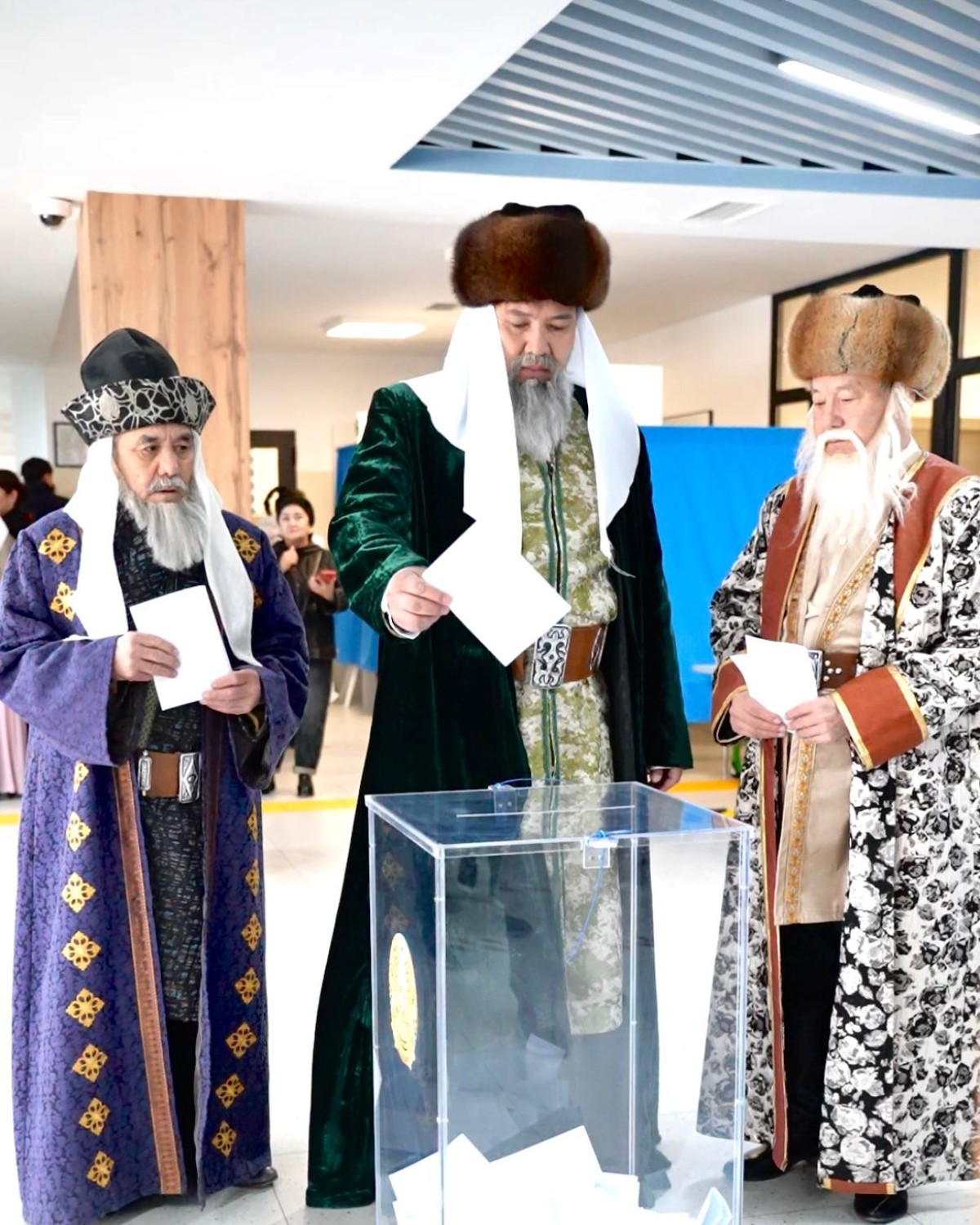 Қазақ хандары Қасым хан, Есім хан және Тәуке хан бейнесіндегі азаматтар бір мезетте дауыс берді.